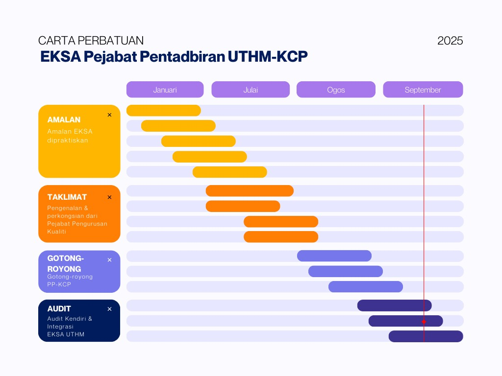 Universiti Tun Hussein Onn Malaysia komited dalam mengamalkan budaya kerja produktif inovatif dan kreatif serta persekitaran yang kondusif bagi memastikan sistem perkhidmatan yang berkualiti, cekap dan efisien melalui pelaksanaan EKSA yang berterusan.